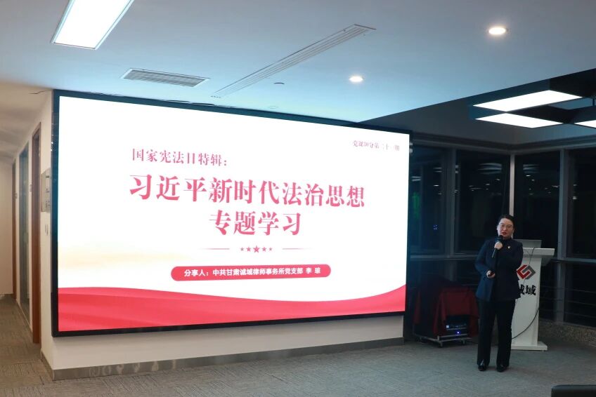 2025年12月4日,诚域律师事务所党支部举办第二十一期“党课30分”专题学习。本期党课以国家宪法日为契机,由党员律师李琼分享《国家宪法日特辑——习近平法治思想专题学习》。全所人员共同参与,深入学习了宪法精神与新时代法治思想的核心内涵。