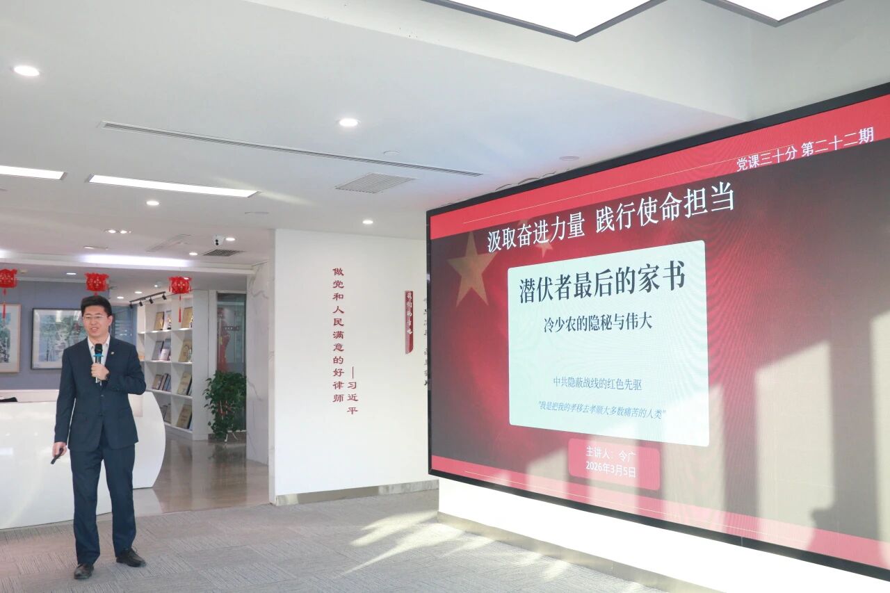 2026年3月5日,诚域律师事务所党支部举办第二十二期“党课30分”专题学习活动。本期党课由党员律师令广主讲,以《潜伏者最后的家书——冷少农的隐秘与伟大》为题,带领全所同仁重温中共隐蔽战线先驱冷少农的感人事迹。