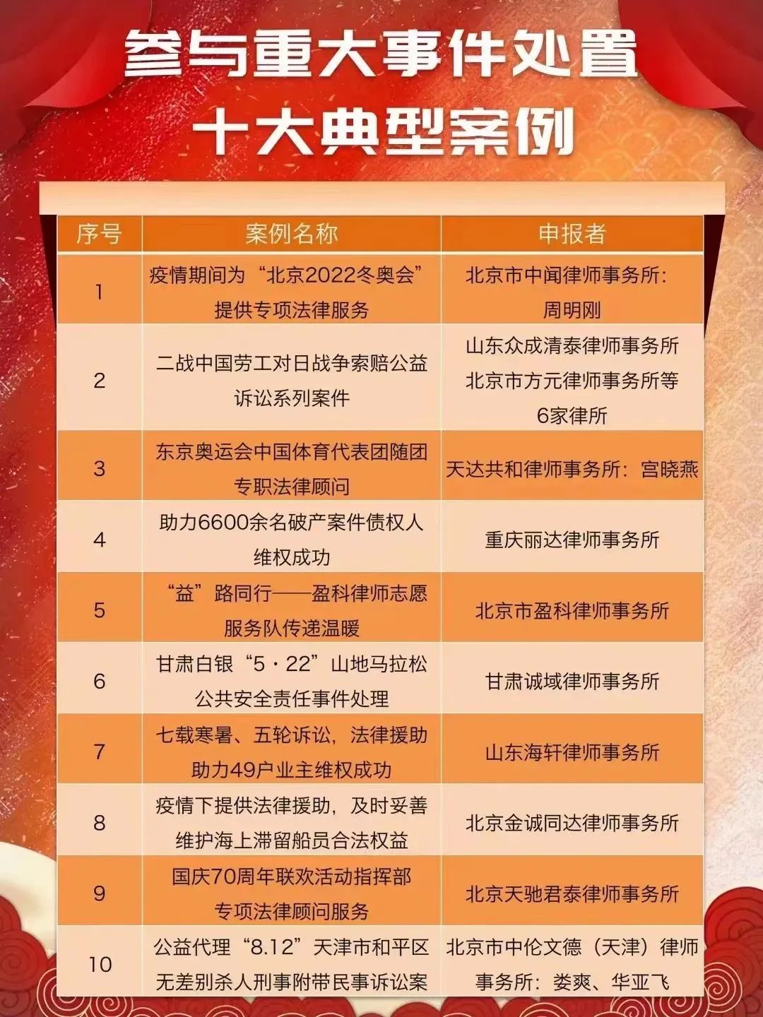 2022年9月8日,法治日报社联合中国政法大学律师学研究中心面向全国征集“首届律师公益(社会责任)典型案例”。诚域律师事务所全程参与承办的“甘肃白银5·22山地马拉松公共安全责任事件处理” 在数百件参评案例中脱颖而出,最终荣获“首届律师公益参与重大事件处置十大典型案例”,并获得表彰。