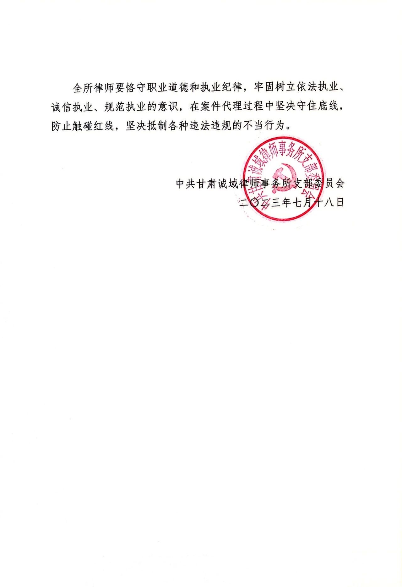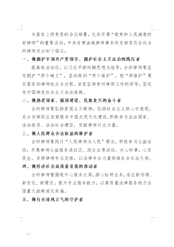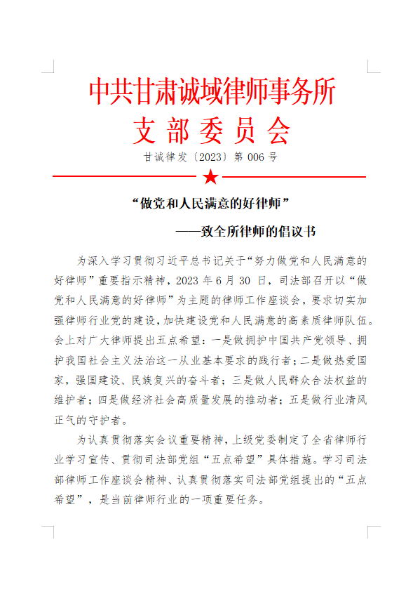 为贯彻落实司法部党组对律师工作“五点希望”的重要指示精神,落实上级党委的工作部署,中共甘肃诚域律师事务所支部委员会向全所律师发出《“争做党和人民满意的好律师”——致全所律师的倡议书》,以下为倡议书全文。